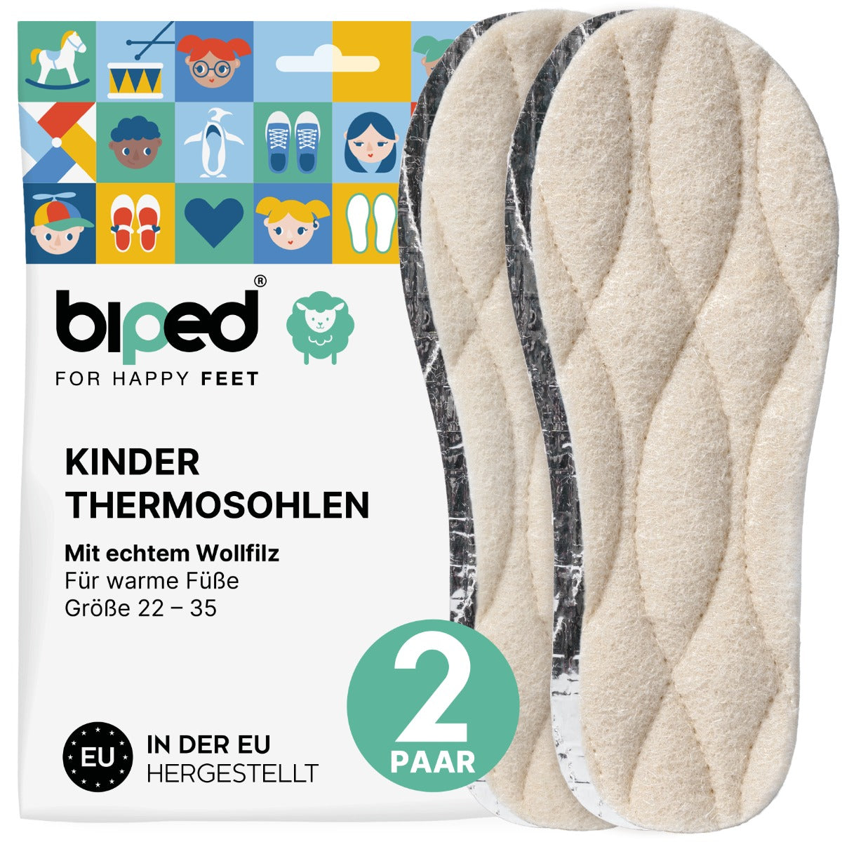 Biped Kinder Thermo Einlegesohlen mit echter Lammwolle und Aluminium Unterseite erhalten Sie im günstigen 2 Paar Set in Doppelgrößen von 22 bis 35. Bei Bedarf lassen sich die Thermosohlen ganz leicht zuschneiden.