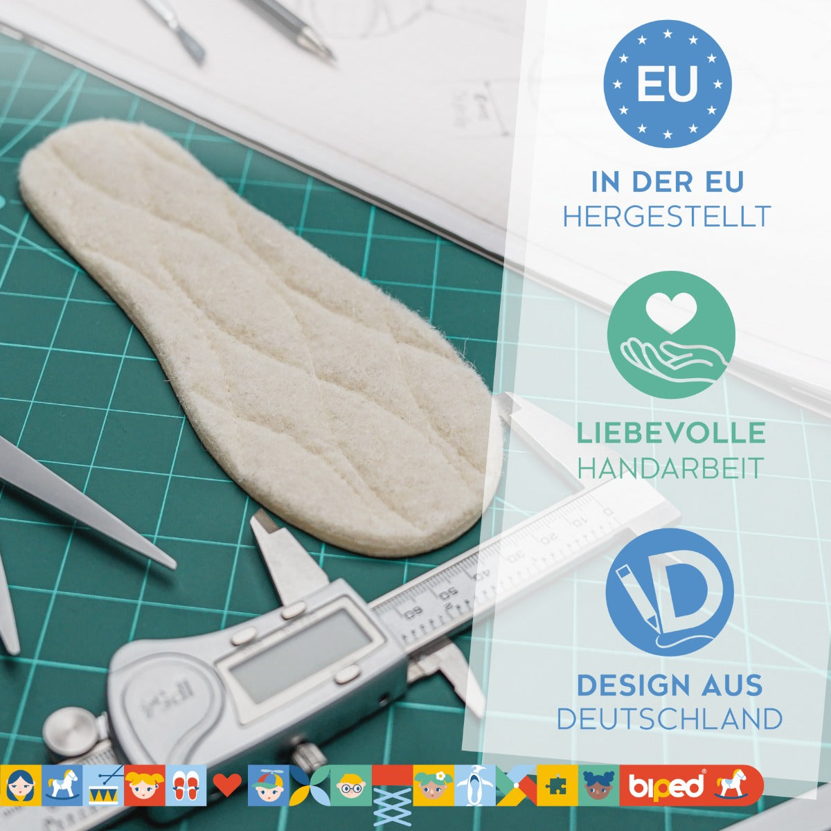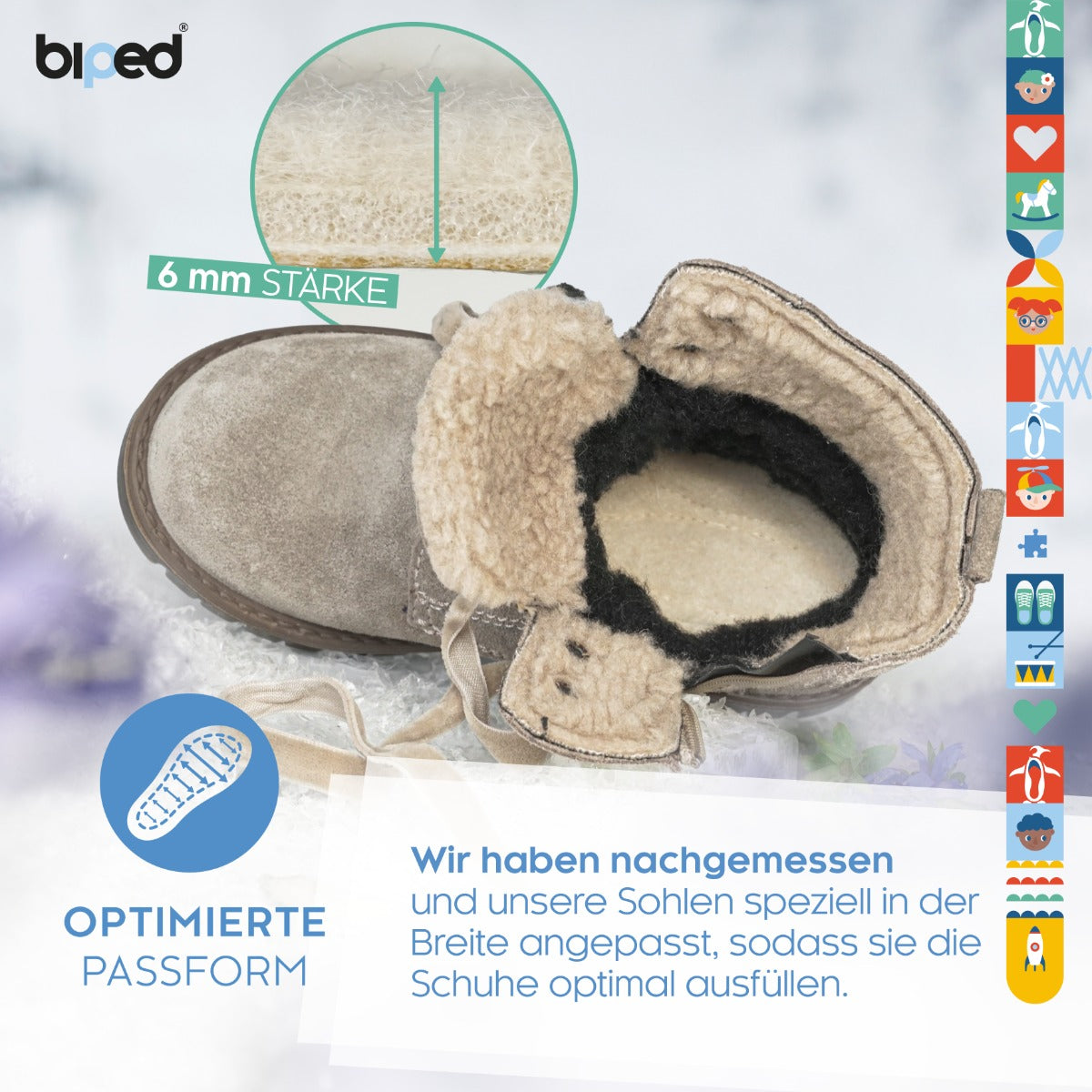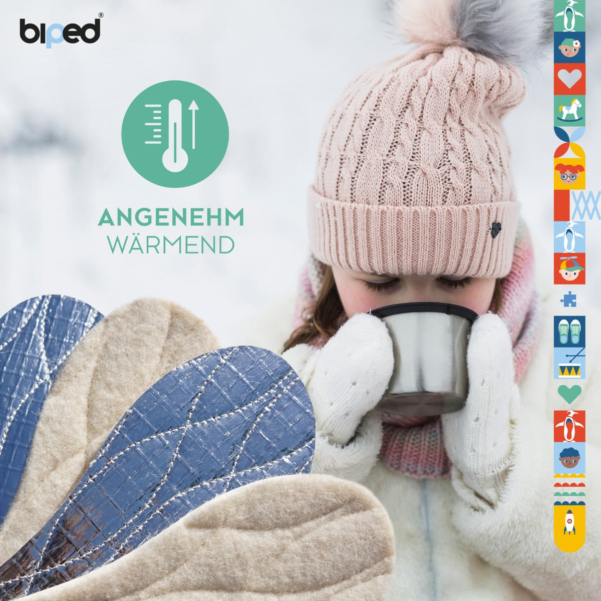 Biped Kinder Thermosohlen, das sind zuverlässig wärmende Einlegesohlen, mit kuschelig weicher echter Lammwolle.