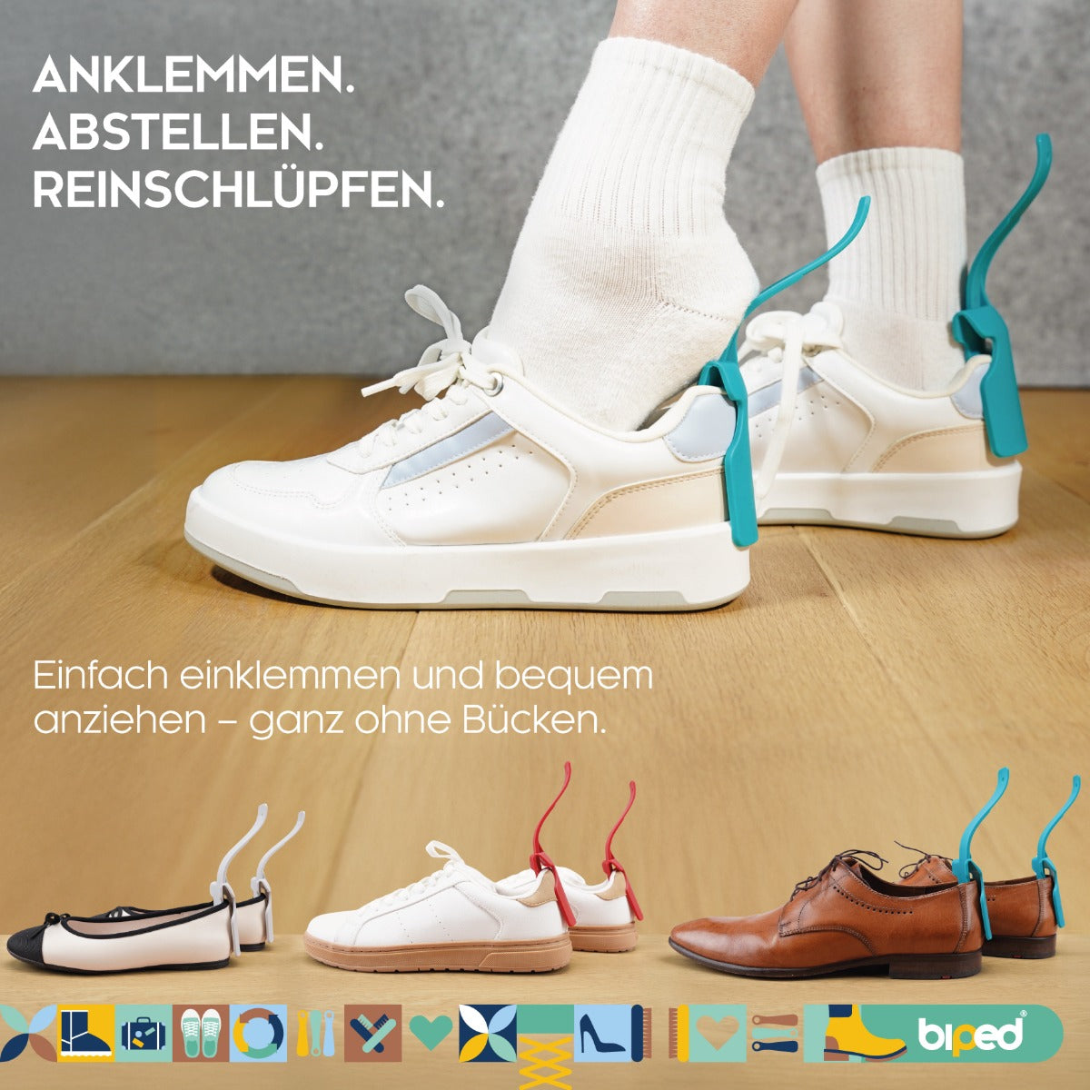 EINFACHES ANZIEHEN: Schuh in die Hand nehmen, Mini Schuhlöffel einklemmen, abstellen und mühelos hineinschlüpfen – für bequemes Anziehen ohne Verrutschen, Ziehen oder Bücken.