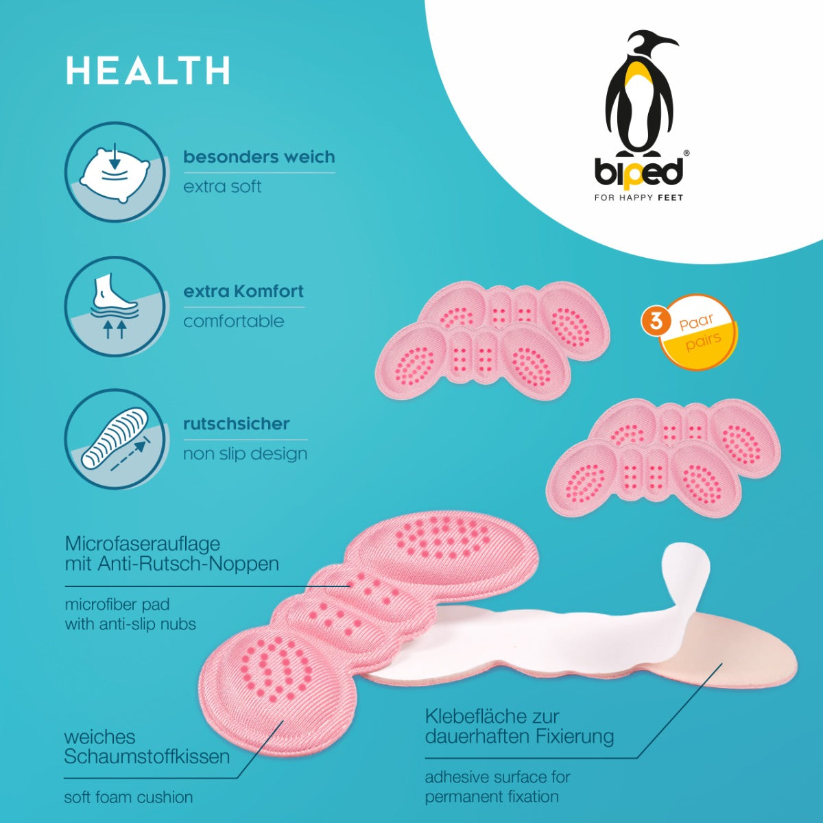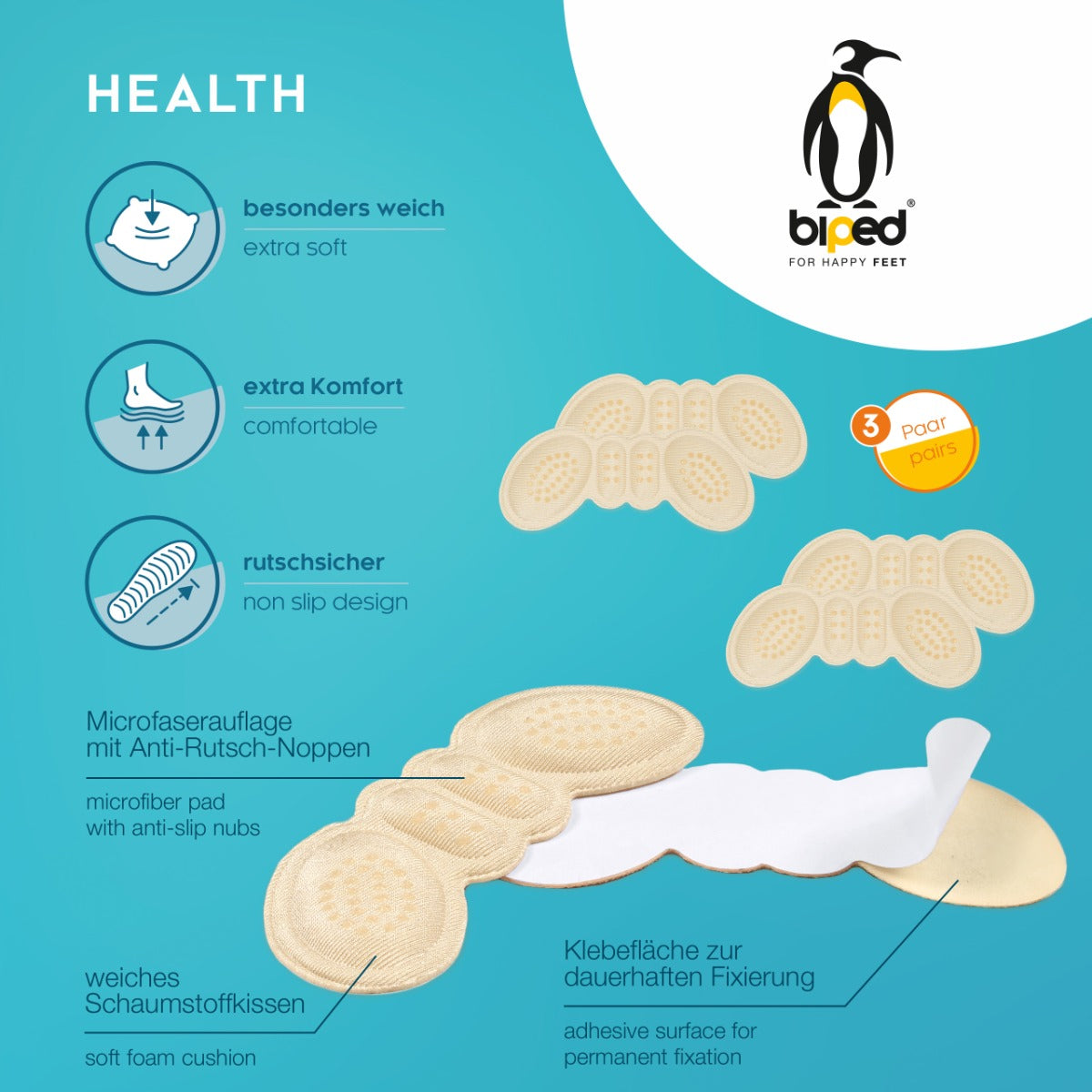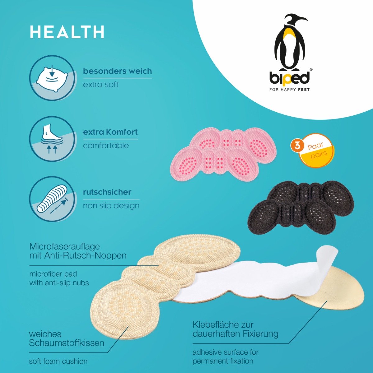 biped HEALTH 3 Paar Fersenpolster für zu große Schuhe - Fersenschützer genoppt - selbstklebende Fersenkissen zur Vorbeugung von Blasen und Wundscheuern