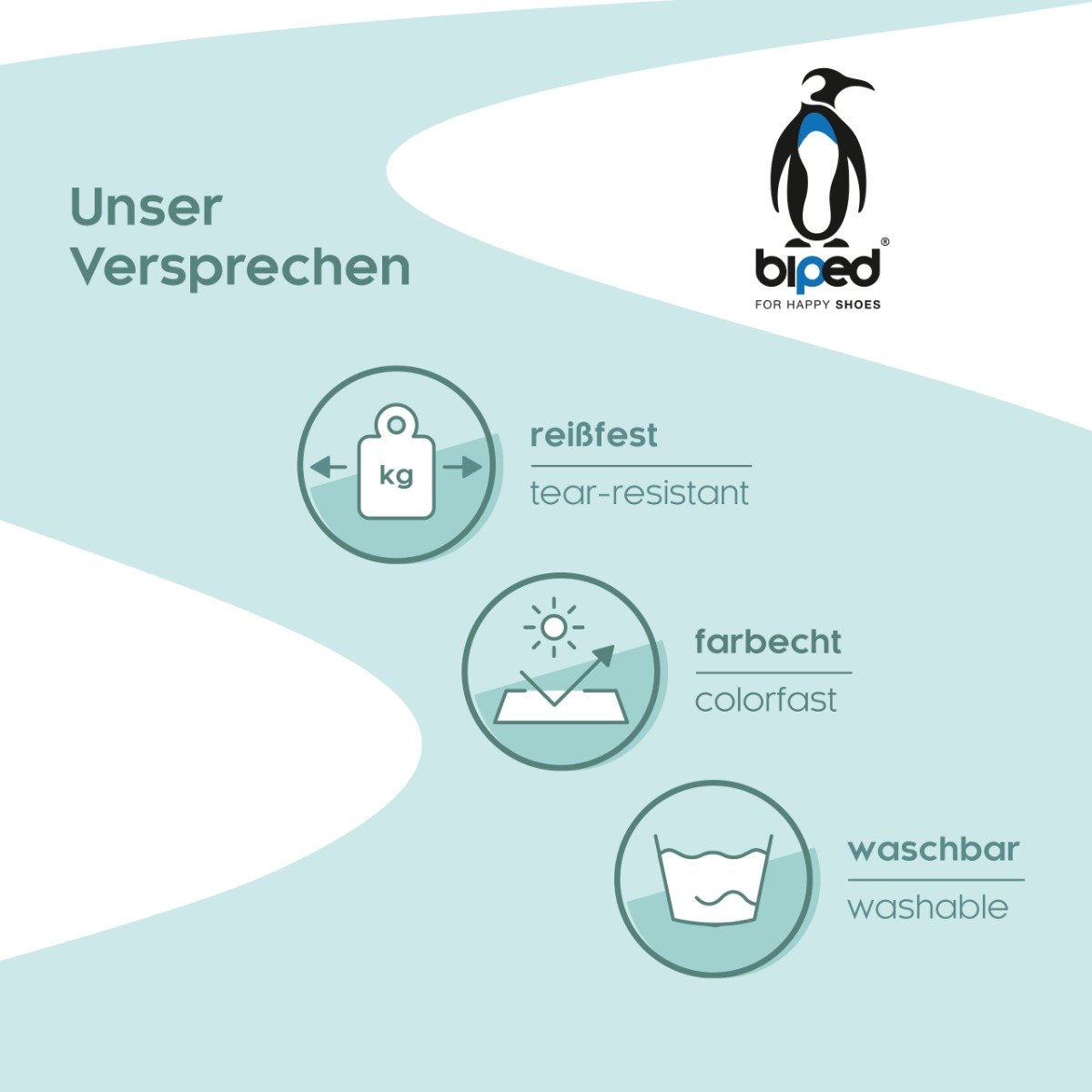 Biped Qualitäts-Schnürsenkel aus Polyester sind per Handwäsche in mildem Seifenwasser einfach zu reinigen.
