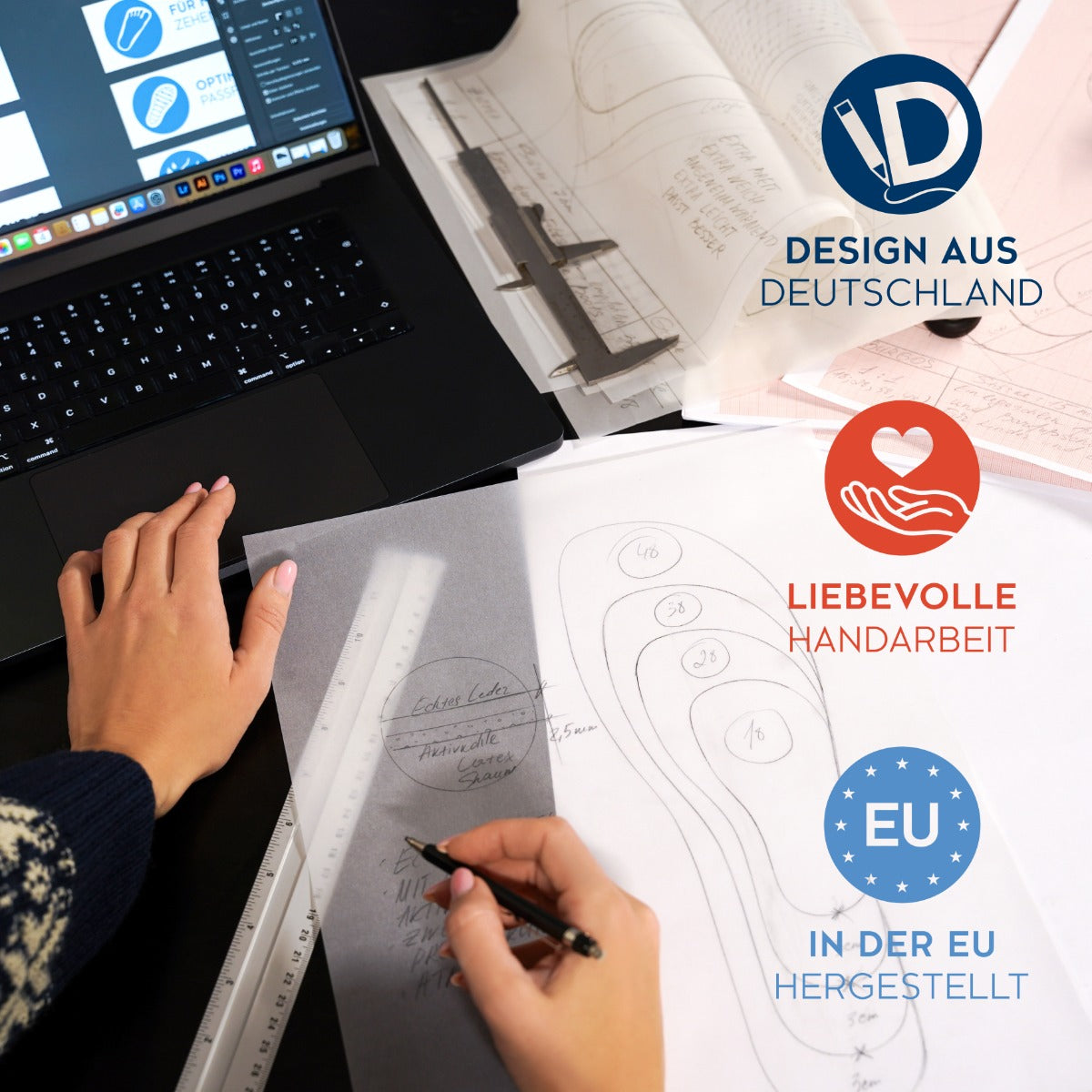 HERGESTELLT IN DER EU: Sie unterstützen mit Ihrem Kauf europäische Qualitätsarbeit und faire Arbeitsbedingungen. Unsere Einlegesohlen werden sorgfältig und mit viel Liebe von Hand gefertigt.