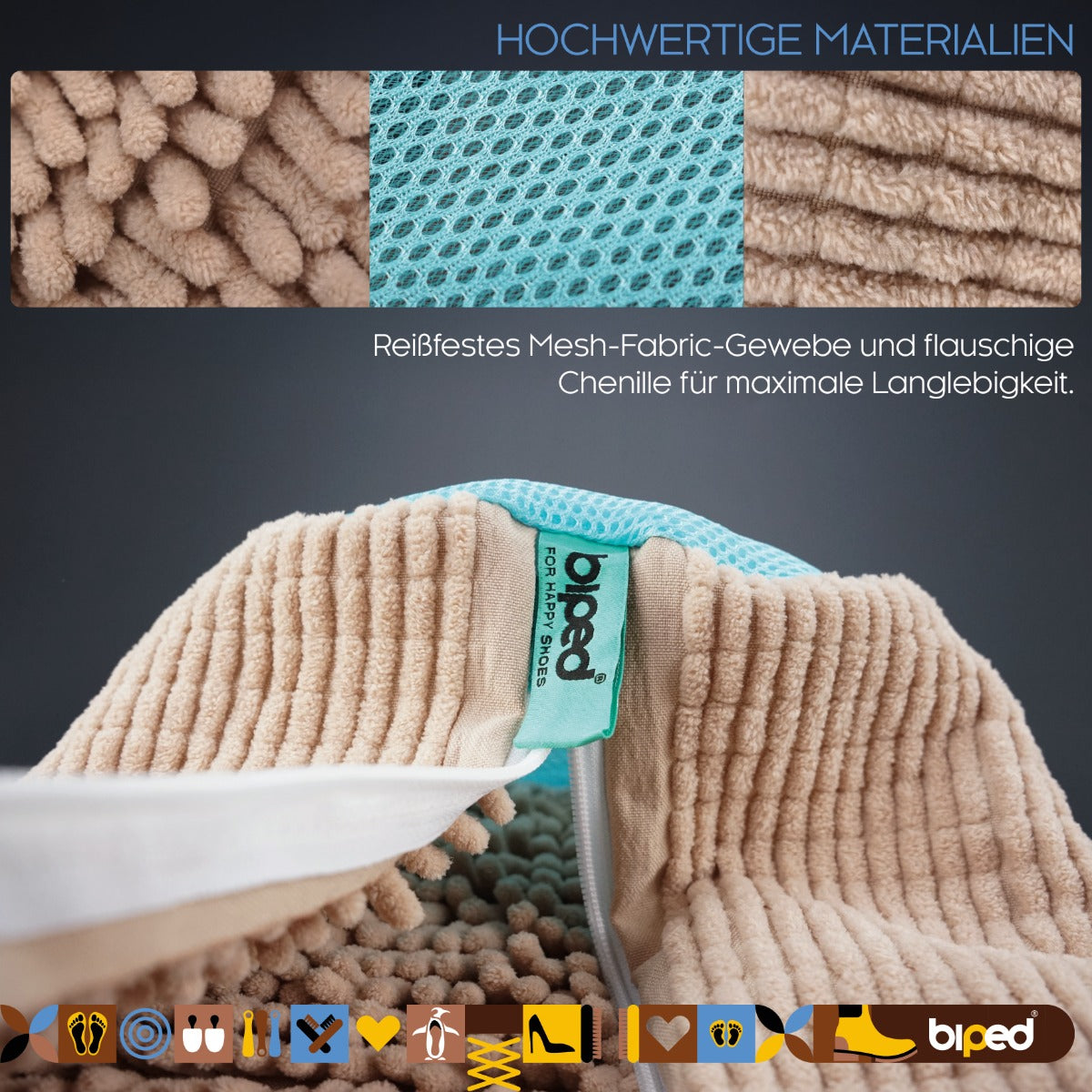Unser Schuh Waschbeutel ermöglicht eine gründliche und schonende Reinigung von Schuhen in der Waschmaschine. Dank der Kombination aus flauschigem Chenille Stoff und robustem Mesh-Fabric sorgt er für optimale Wasser- und Waschmittelzirkulation, sodass Ihre Schuhe gründlich gereinigt werden, ohne dabei Material oder Form zu beschädigen.