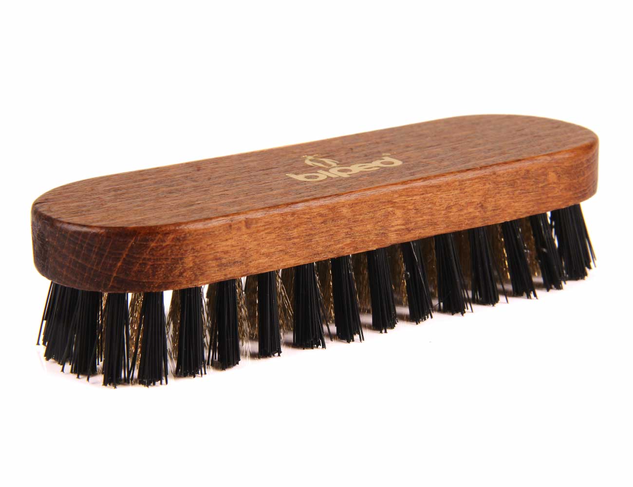 Bestückt ist die biped Veloursleder Bürste mit Synthetik- und Messingborsten. Schmutz und Staub lassen sich mit der Schuhbürste einfach aus Rauleder heraus bürsten. Den eventuell entstehenden Abrieb entfernen Sie leicht mit einem Tuch oder pusten ihn vom Leder.